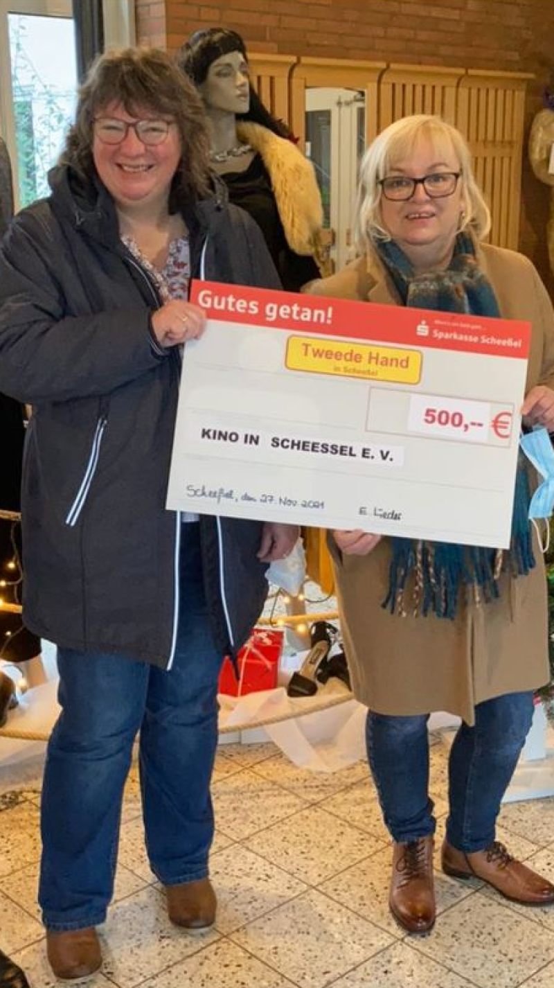 Am 27.11.2021 überreichte der Second-Hand-Laden Tweede Hand aus Scheeßel dem Kino in Scheeßel e.V. eine Spende in Höhe von 500€. Die Vorsitzenden Anja Schouten und Karola Hoffmann nahmen im Ladengeschäft des Vereins den symbolischen Scheck von Edeltraud Lieder entgegen und bedankten sich herzlich.